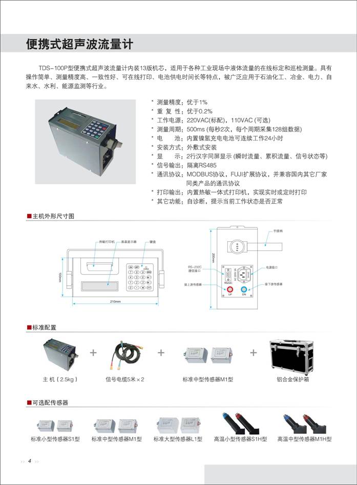 便攜式超聲波流量計 一、概 述 AK-TDS-100P型便攜式超聲波流量計利用了低電壓、多脈沖時差原理,采用高精度和超穩定的雙平衡信號差分發射、差分接收數字檢測技術來測量順流和逆流方向的聲波