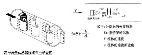 一定雷諾數范圍內(2×104~7×106 ),旋渦的釋放頻率f與流體流速V及旋渦發生體的迎流面寬度d之間關系式為f=St?v/d,式中St 為斯特勞哈數,它是一個無量綱的系數,只要準確測出頻率f,就可以求得流體流速v,由v求出體積流量。