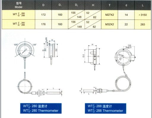 WTZ/WTQ-280/288系列壓力式溫度計該型號壓力式溫度計適用于過程中較遠距離的非腐蝕性液體或氣體的測量,電接點型壓力式溫度計能在工作溫度達到和超過給定值時發出電訊號。